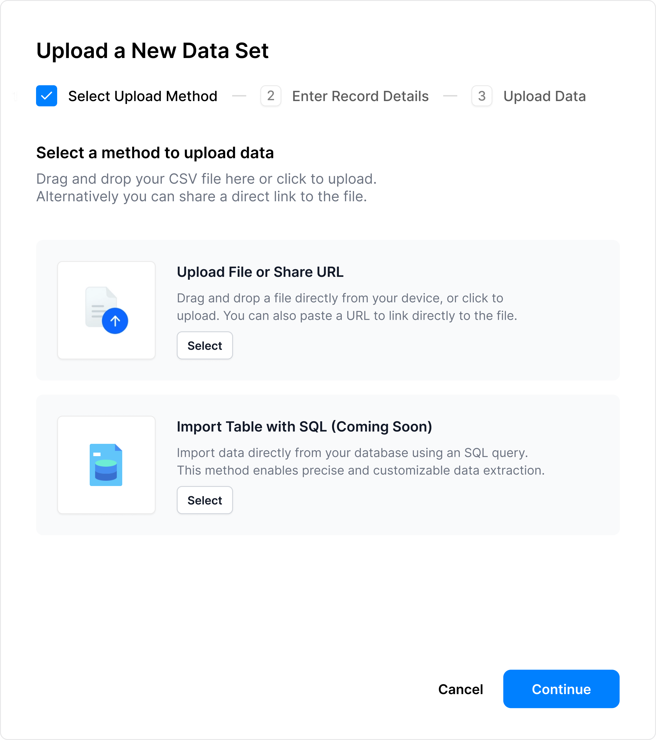 Upload your dataset in just a few clicks: choose direct upload, import via URL, or connect through a SQL query.